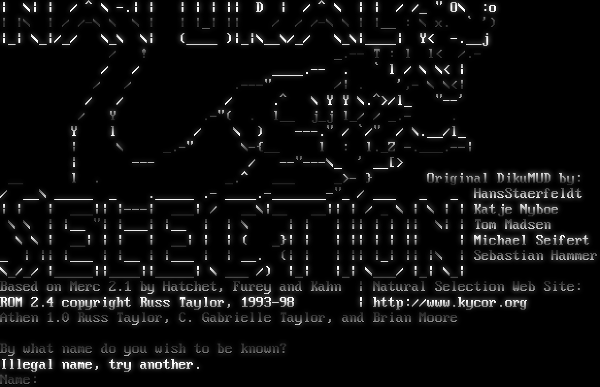 _ _ _ _​______ _ _ _​___ _ _ _​___ \| \\ \| \| / \\ \|__ __\|\| \| \| \|\| \\ / \\ \| \| .- . /_​"-._ \| \\\| \| / ^ \\ -.\| \| \| \| \| \|\| D \| / ^ \\ \| \| / /_ " O\\ :o \| \|\\ \| / /-\\ \\ \\ \| \| \|_\| \|\| / / /-\\ \\ \| \|__ : \\ x. \` ') \|_\| \\_\|/_/ \\_\\ \\\| (_​___ )\|_\|\\__\\/_/ \\_\\\|_​___\| Y< -​.__j / ! _​.-- T : l l< /.- / / _​___.-- . \` l / \\ \\< \| / / .​---" /\| . ',- \\ \\<\| / / / .^ \\ Y Y \\.^>/l_ "--' / Y .-"( . l__ j_j l_/ / _.- . Y l / \\ ) -​--." / \`/" / \\.__/l_ \| \\ _​.-" \\-{__ l : l._Z -​.___.--\| \| --- / -​-"---\\_ ' __[> __ l . _.^ ___ _>- } Original DikuMUD by: / __\\ _​____ _ .​_____ .- _​___.-_______-"_ / ___ _ _ HansStaerfeldt \| \| \| ___\|\| \|---\| ___\| / __\\\|__ __\|\| \| / _ \\ \| \\ \| \| Katje Nyboe \\ \\ \| \|__ "\| \|___\| \|__ \| \| \\ \| \| \| \|\| \| \| \|\| \\\| \| Tom Madsen \\ \\ \| __\| \| \| \| __\| \| \| ( _}\| \| \| \|\| \| \| \|\| \| Michael Seifert _ \| \|\| \|___ \| \|__ \| \|___ \| \| __. (\| \| \| \|\| \|_\| \|\| \|\\ \| Sebastian Hammer \\_/_/ \|_​____\|\|_​___\|\|_​____\| \\ ___ /) \|_\| \|_\| \\___/ \|_\| \\_\| Based on Merc 2.1 by Hatchet, Furey and Kahn \| Natural Selection Web Site: ROM 2.4 copyright Russ Taylor, 1993-98 \| http://www.kycor.org Athen 1.0 Russ Taylor, C. Gabrielle Taylor, and Brian Moore By what name do you wish to be known? Illegal name, try another. Name: