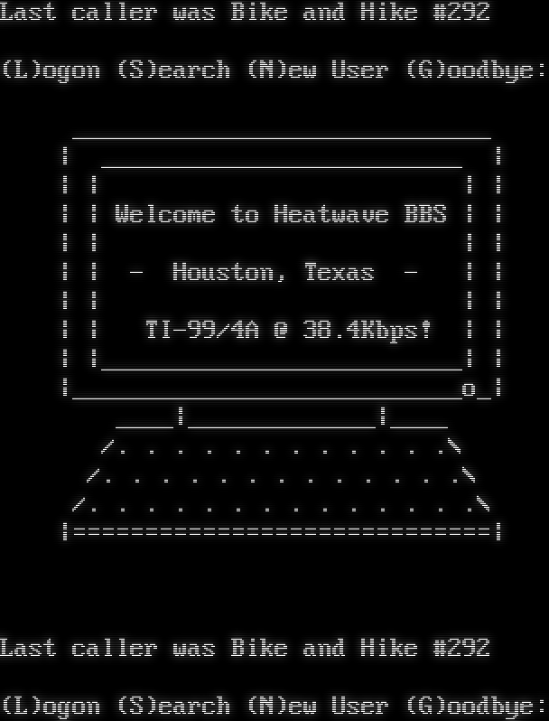 _​____________________________ \| _​________________________ \| \| \| \| \| \| \| Welcome to Heatwave BBS \| \| \| \| \| \| \| \| - Houston, Texas - \| \| \| \| \| \| \| \| TI-99/4A @ 38.4Kbps! \| \| \| \|_​________________________\| \| \|_​__________________________o_\| _​___\|_​____________\|_​___ /. . . . . . . . . . . .\\ /. . . . . . . . . . . . .\\ /. . . . . . . . . . . . . .\\ \|=​============================\| Last caller was Bike and Hike #292 (L)ogon (S)earch (N)ew User (G)oodbye: _​____________________________ \| _​________________________ \| \| \| \| \| \| \| Welcome to Heatwave BBS \| \| \| \| \| \| \| \| - Houston, Texas - \| \| \| \| \| \| \| \| TI-99/4A @ 38.4Kbps! \| \| \| \|_​________________________\| \| \|_​__________________________o_\| _​___\|_​____________\|_​___ /. . . . . . . . . . . .\\ /. . . . . . . . . . . . .\\ /. . . . . . . . . . . . . .\\ \|=​============================\| Last caller was Bike and Hike #292 (L)ogon (S)earch (N)ew User (G)oodbye: