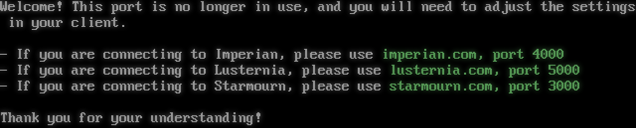 Welcome! This port is no longer in use, and you will need to adjust the settings in your client. - If you are connecting to Imperian, please use imperian.com, port 4000 - If you are connecting to Lusternia, please use lusternia.com, port 5000 - If you are connecting to Starmourn, please use starmourn.com, port 3000 Thank you for your understanding!