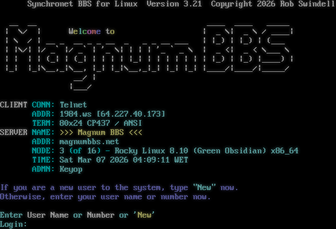 Synchronet BBS for Linux Version 3.21 Telnet connection from: 64.227.40.173 Resolving hostname... _ ∩╗┐ Synchronet BBS for Linux Version 3.21 Copyright 2026 Rob Swindell __ __ _​___ _​___ _​____ \| \\/ \| Welcome to \| _ \\\| _ \\ / _​___\| \| \\ / \| __ _ __ _ _ __ _ _ _ __ ___ \| \|_) \| \|_) \| (___ \| \|\\/\| \|/ _\` \|/ _\` \| '_ \\\| \| \| \| '_ \` _ \\ \| _ <\| _ < \\___ \\ \| \| \| \| (_\| \| (_\| \| \| \| \| \|_\| \| \| \| \| \| \| \| \|_) \| \|_) \|_​___) \| \|_\| \|_\|\\__,_\|\\__, \|_\| \|_\|\\__,_\|_\| \|_\| \|_\| \|_​___/\|_​___/\|_​____/ __/ \| \|___/ CLIENT CONN: Telnet ADDR: 1984.ws [64.227.40.173] TERM: 80x24 CP437 / ANSI SERVER NAME: >>> Magnum BBS <<< ADDR: magnumbbs.net NODE: 3 (of 16) - Rocky Linux 8.10 (Green Obsidian) x86_64 TIME: Sat Mar 07 2026 04:09:11 WET ADMN: Keyop If you are a new user to the system, type "New" now. Otherwise, enter your user name or number now. Enter User Name or Number or 'New' Login: