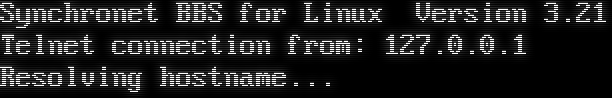 Synchronet BBS for Linux Version 3.21 Telnet connection from: 127.0.0.1 Resolving hostname...