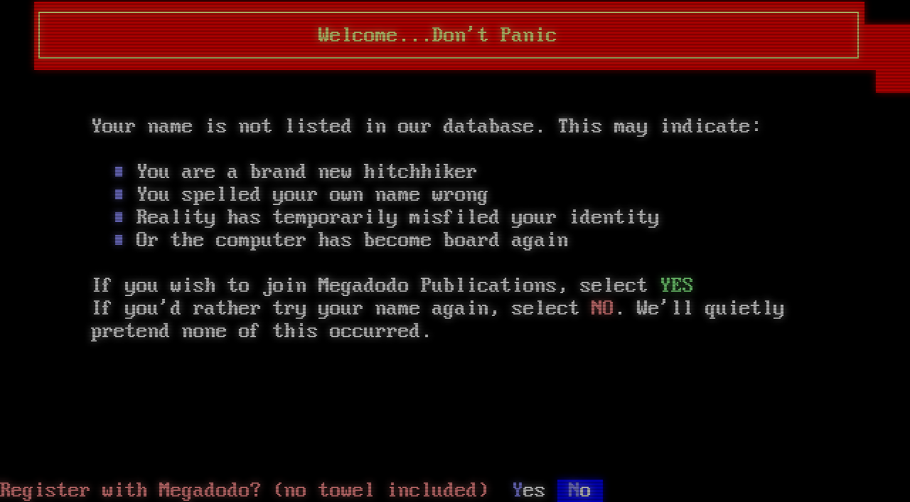 Mystic BBS Version 1.12 A48 Copyright (C) 1997-2023 By James Coyle Detecting terminal emulation: Press [.ESC.] TWICE within 15 seconds - failure assumes Vogon infiltration... ─────────────────────────────────────────────────────────────────────────── Welcome, Traveller! ─────────────────────────────────────────────────────────────────────────── ██▓██▓ ███▀▀███▀▀█▓▄ ███▀▀█▓▄ ███▀▀█▓▄ ███▀▀█▓▄▄▄██▀▀███ ███▀▀█▓▄▄▄██▀▀███ ███▀▀█▓ ███ ███ ███ ███▄▄██▀ ███ ███▄▄▄▄▄▄███ ███ ███ ███ ███ ███ ███ ███ ██ ███ ███ ███ ███ ▄▄▄▄ ███▄▄███ ███ ███ ███ ███ ███ ███ ███ ███ ███ ██ ███ ███ ███ ███▄▄██▓ ▄▄▄▄▄██▀ ███▄▄███ ███▄▄███ ███▄▄███ ███▄▄███ ███▄▄██ ▄▄▄▄▄ ▄▄ ▄▄ ▄▄▄▄▄ ▄▄ ▄▄ ▄▄▄▄▄ ▄▄▄▄▄ ▄▄▄▄▄▄ ▄▄ ▄▄▄▄▄ ▄▄▄▄ ▄▄▄▄▄ █▓▄▄▀ █▓ █▓ █▓▄▄▀ █▓ █▓ █▓ ▀▀ █▓▄▄▓ █▓ █▓ █▓ █▓ █▓ █▓ █▓▄▄▄ ▄▒ ▄▒▄▄▒ ▄▒▄▄▒ ▄▒▄▄█ ▄▒ ▄▒▄▄▒ ▄▒ ▄▒ ▄▒ ▄▒ ▄▒▄▄▒ ▄▒ ▄▒ ▄▄▄▄▒ ─────────────────────────────────────────────────────────────────────────── Building 134-A, 7-ZX-53, Ursa Minor Beta, Western Spiral Arm ─────────────────────────────────────────────────────────────────────────── You have connected to a Sub-Etha node maintained by Megadodo Publications, alleged publishers of the Hitchhiker's Guide to the Galaxy! [■] Identify yourself (Enter NEW to join): ┌───────────────────────────────────────────────────────────────────────┐ │ Welcome...Don't Panic │ └───────────────────────────────────────────────────────────────────────┘ ▄▄▄▄▄▄▄▄▄▄▄▄▄▄▄▄▄▄▄▄▄▄▄▄▄▄▄▄▄▄▄▄▄▄▄▄▄▄▄▄▄▄▄▄▄▄▄▄▄▄▄▄▄▄▄▄▄▄▄▄▄▄▄▄▄▄▄▄▄▄▄▄▄ Your name is not listed in our database. This may indicate: ■ You are a brand new hitchhiker ■ You spelled your own name wrong ■ Reality has temporarily misfiled your identity ■ Or the computer has become board again If you wish to join Megadodo Publications, select YES If you'd rather try your name again, select NO. We'll quietly pretend none of this occurred. Register with Megadodo? (no towel included) Yes No
