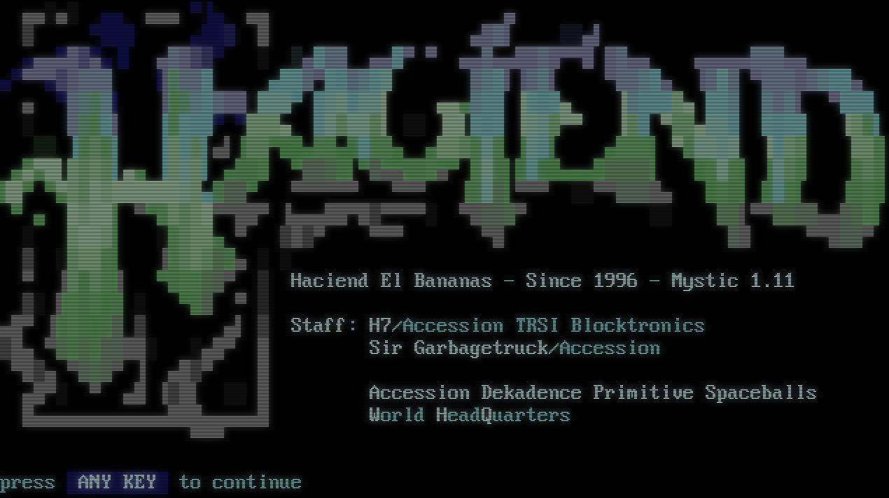 Mystic BBS v1.12 A38 for Linux Node 1 Copyright (C) 1997-2017 By James Coyle Available languages: 1 pc-ansi (cp437 recommended) 2 Amiga Ascii (moSoul/topaz recommended) Select language: ▄▄░▄░ ▄▄ ▄▄▄ ▀▐▄ ▄▄▄ ▓ ▀███▄██░ █▄█▓▌ ░░▄▌ ▄▄▄▄█▓▄▄▐▌ ▄▓█▓▒▀ ░ ░▄░▓▓ ▄▄░▀ ▀ ▄▄▓▄▄██▓█▀▀█ █▓▄▄ ▄▄▄▄▄▓▓▓▄▄ ▄▀▀▀▀▓█▓▓▓ ▐░▓▓░▄░░▓▀░░▓▒░▒▓▒░▌▐▓▒▌ ▀▓▓▒░▄ ▐▓░▓ ▀▓▓▓█▓▒░░▄ ▄ ▀▓▒░▒▌ ▐░░▒░▓██░▒▒▒▀ ░▒▓░▒▒▌ ▄▄▄▒░░ ▐░░░▄ ▐▒░░░▓▄ ░░▒ ▒▓▒▌ ▀░░░ ░ ▓░░░▌ ▐░░░░▀ ▀▓▓▓▄ ░▓▒▓▓▒▌ ░░ ▐█▌░░░ ▐▓▒▒▀▀ ▐▒░ ▀▒▒▄▒▒░ ░░░░ ▐▓░▌ ░░ ▐░▒░▌ ▐▓░▒▌▄▌▐▒▒▀██▄░░▄█░░░▄ ▄▓▓▒░▒░ ▐▒░▌ ▄░░░▌ ▀░▓▓▒▓ ▐░▓▒ ▓▓░ ▄▄▀█▌▓▒▓▒▌▄▄ ▐▓▒▓▌ ▄░░░ ▀▓▓▒░▌▀▓▄▄░░░▄▀ ░▓░▌█░██▄▄▄█▒▒▒▒▌ █░▓░▌ ▐▒▒░ ░▒░ ▐█▀ ▀▀▓▒█▓██████▓▓▄░▓▓▀ ▀▀▀▀▀▀ ▀▀▀ ▐░▒▒▌▀▀▀ ░░▀▀▓▓▓█▄ █░░▌ █░░▌ ▐░░█ ▀ ▄ █▓██▌ ▀▀░▓▒▓█▀▀██▀ ▐▄▄▄██▀█▓▀▀▀▀░ ▀█▓▓▒▀░░ ▒▒▌▀▀▒▒▓▓▄▄▓▒░▌ ░ ▓██▓▌ ░░▒▓▓▄ ▀ ▓█▓▀ ▀▀▀▀█ ▓█▀▀█▓▓▀ ▓ ░▒▓▓░▌ ▐░▒▓▒▒░▄ ░ ░ ▀ ▐▒░▒░▐ ▀░░░▒▓▀ ▒ Haciend El Bananas - Since 1996 - Mystic 1.11 ▓░ ▌░░░█░ ░ ▀░▓ ▀ ▒ ▄█▀ ▐░░░█░▓ ▓▄▌ ▓ Staff: H7/Accession TRSI Blocktronics ▓█▄ ▀▒░▒░▓▓██░ ░▄█▀ █Sir Garbagetruck/Accession ▀█▓▄ ▀▓▒▓▀ ▐ ▄█▓▀ █ ▄█▀░ ▀ ▄█ ▐▓█▌ ░░ █ Accession Dekadence Primitive Spaceballs █▄▄▄▄▄▄▄▄▄▄▄▄███▄▄▄▄▄█World HeadQuarters ▀▀▀ press ANY KEY to continue