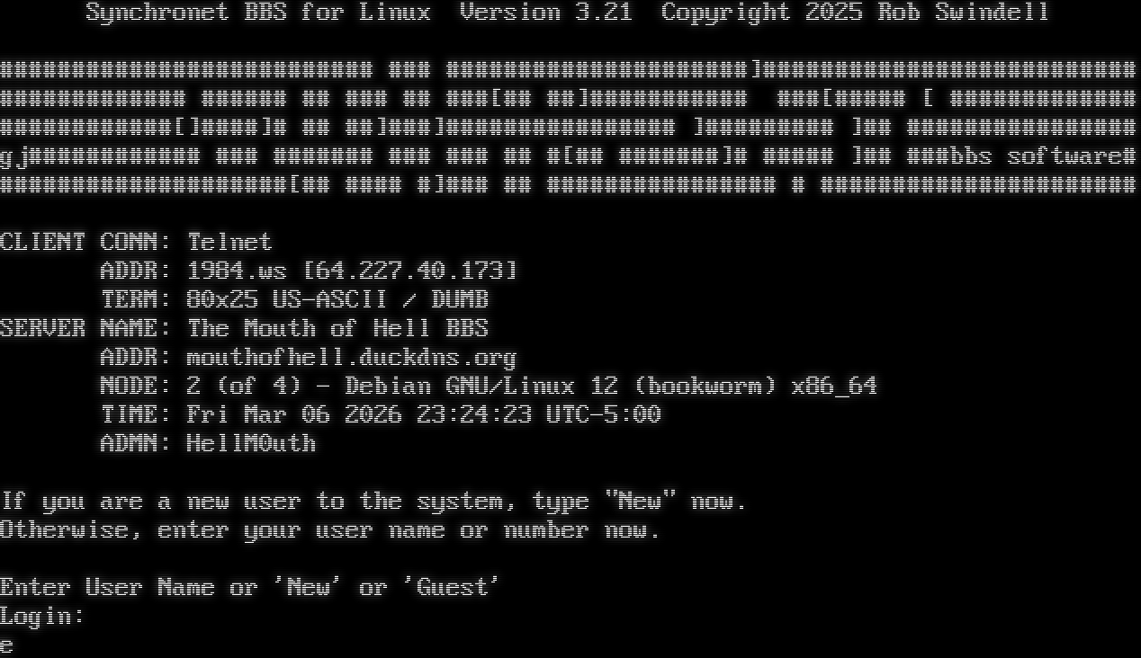 Synchronet BBS for Linux Version 3.21 Telnet connection from: 64.227.40.173 Resolving hostname... _ ∩╗┐ Synchronet BBS for Linux Version 3.21 Copyright 2025 Rob Swindell #​######################### ### #​####################]#​######################### #​############ #​##### ## ### ## ###[## ##]#​########## ###[#​#### [ #​############ #​###########[]#​###]# ## ##]###]#​############### ]#​######## ]## #​############### gj#​########### ### #​###### ### ### ## #[## #​######]# #​#### ]## ###bbs software# #​###################[## #​### #]### ## #​############### # #​##################### CLIENT CONN: Telnet ADDR: 1984.ws [64.227.40.173] TERM: 80x25 US-ASCII / DUMB SERVER NAME: The Mouth of Hell BBS ADDR: mouthofhell.duckdns.org NODE: 2 (of 4) - Debian GNU/Linux 12 (bookworm) x86_64 TIME: Fri Mar 06 2026 23:24:23 UTC-5:00 ADMN: HellM0uth If you are a new user to the system, type "New" now. Otherwise, enter your user name or number now. Enter User Name or 'New' or 'Guest' Login: Bee