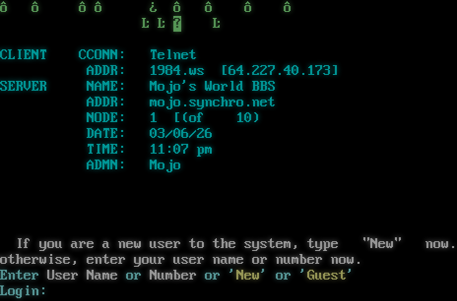 Synchronet BBS for Win32 Version 3.19 Telnet connection from: 64.227.40.173 Resolving hostname... _ _ Synchronet BBS for Win32 Version 3.19 Copyright 2022 Rob Swindell Ŀ Ŀ ڿ Ŀ Ŀ ڿ Ŀ Ŀ ڿ Ŀô ô ô ô ¿ ô ô ô ô CLIENT C CONN: TelnetADDR: 1984.ws [64.227.40.173]SERVERNAME: Mojo's World BBSADDR: mojo.synchro.netNODE: 1 [(of 10)DATE: 03/06/26TIME: 11:07 pmADMN: Mojo If you are a new user to the system, type "New" now.otherwise, enter your user name or number now. Enter User Name or Number or 'New' or 'Guest' Login: