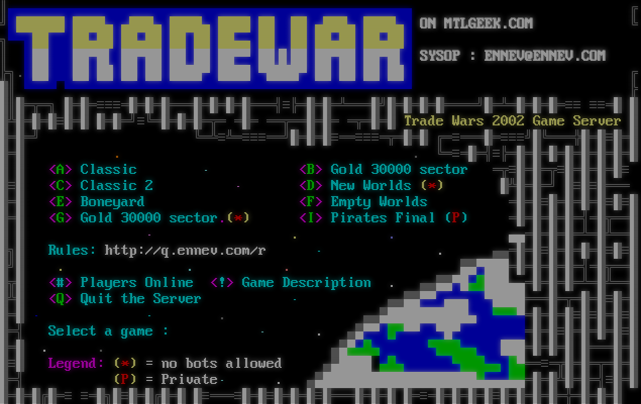 Telnet connection detected. Please enter your name (ENTER for none): TradeWars Game Server Copyright (C) EIS TWGS v2.20b www.eisonline.com Server registered to Stephane Venne Supports up to 25 games and 100 nodes ▐═▐═╬═▐═▐═▐·▐═▐═╬═▐═▐═▐·▐═▐═╬═▐═▐═▐·▐═▐═╬═▐═▐═▐·▐═▐═╬═▐═▐═▐·▐═▐═╬═▐═▐═╬═▐═▐═▐·▐ ▐═▐≡≡·≡≡▐╗▐═▐═≡≡≡═▐═▐·▐═▐╔▐≡▐═▐╗≡╔▐═▐═╣≡╠═▐╔▐═▐≡═≡═≡▐═▐·▐═▐═▐═▐═╣╠═≡▐═══▐═▐═≡·≡ ║▄▄▄▄▄▄▄▄▄▄▄▄▄▄▄▄▄▄▄▄▄▄▄▄▄▄▄▄▄▄▄▄▄▄▄▄▄▄▄▄▄▄▄▄▄▄▄▄▄▄╔ ╝████████████▄ ▄███▄ ████▄ ████ ██ ██ ▄███▄ ████▄ ON MTLGEEK.COM╚ ╗▀▀████▀▀██▄██ ██▄██ ██ ██ ██▄▄ ██ ██ ██▄██ ██▄██ ║ ██ ██▀█▌ ██▀██ ██ ██ ██▀▀ ██▐▌██ ██▀██ ██▀█▌ SYSOP : ENNEV@ENNEV.COM ╠╗. ██ ██ ██ ██ ██ ████▀ ████ ▀████▀ ██ ██ ██ ██ ╔ ▐║ ▀▀▀▀ ▄▄▄▄▄▄▄▄▄▄▄▄▄▄▄▄▄▄▄▄▄▄▄▄▄▄▄▄▄▄▄▄▄▄▄▄▄▄▄▄▄▄▄╠ ▐║▐═╦═╗ ▐═▐═≡≡≡═▐═▐═▐═══▐═▐═▐═▐═══╣≡╠═▐═▐═╩═══▐╝▐═▐═▐═▐════╝▐═╩═▐═▐═▐═≡≡·≡≡═▐·▐ ▐╩▐═▐═▐≡▐═▐·▐═▐═╝≡╚═▐═▐═▐═╦═·═▐═·══╦══▐═▐═·═╦═▐═▐ Trade Wars 2002 Game Server ▐ ▐═▐═╝╚═╩≡╩═≡≡≡══╝▐═▐═▐≡══≡≡≡═╦═▐═▐·╔═≡═══▐═≡≡≡╝▐╚═══╬▐═▐≡▐═▐ ▐═▐.. ╚═≡═▐═╣≡╠═▐═▐═▐═▐═▐═▐═▐═▐ ▐·▐ <A> Classic·<B> Gold 30000 sector ═╦≡▐═▐═╦≡▐═▐═▐═▐≡ ▐≡▐ <C> Classic 2·<D> New Worlds (\*)▐╩▐═▐═╝·▐≡▐≡▐═══ ▐═▐ <E> Boneyard<F> Empty Worlds═▐═▐≡▐═▐═▐═▐≡▐≡▐ ▐═▐ <G> Gold 30000 sector.(\*)<I> Pirates Final (P)═▐═▐═▐═▐═╣═▐╦══▐ ▐·▐·..▄▄═▐═▐═▐═╩═▐╩══▐ ▐╗▐ Rules: http://q.ennev.com/r ·.▄▄═▐═▐≡▐═▐═▐═▐≡▐≡▐ ▐╝▐ ...▀▀▀███═▐═▐═▐═▐═╣═▐╦══▐ ▐╦▐ <#> Players Online <!> Game Description . ▄▄▀▀▀█▄████▄▄═▐═▐═▐═╩═▐╩══▐ ▐╩▐ <Q> Quit the Server·▄▄▀▀▀▀ ▄▄▄ ▀████═══▐═╦═▐═▐≡▐═▐ ▐═▐ ··.▄▄▀██████████▄· ▀▀▀▀═▐═▐═▐≡▐≡▐═▐≡▐ ▐═╣ Select a game :·. ▄▀▀▀ █▀▀▀ ▀█▀ ═▐═▐≡▐═▐═▐═▐≡▐ ▐═▐ ..▄▀▀▄█▄ ▀███▄▄ ███═▐═▐═▐·▐═══▐═▐ ▐≡▐ Legend: (\*) = no bots allowed▄▀████ ▄█▄ ▀███▄▄ █▀══≡═╦▐═▐═╦═▐═▐ ▐═╣ (P) = Private·. ▄▀███████████████████▄▀▀▀▄▄═▐═▐╩▐═▐═╣≡▐═▐ ▐═▐═▐╔▐═≡·≡═▐╗▐≡▐═▐╔▐═▐·▐≡═══≡▐═▐≡▐═▐═▐≡▐═══▐═▐═▐·▐═≡═▐═▐═▐═▐≡▐═▐═▐═▐═╬═▐═▐═▐·