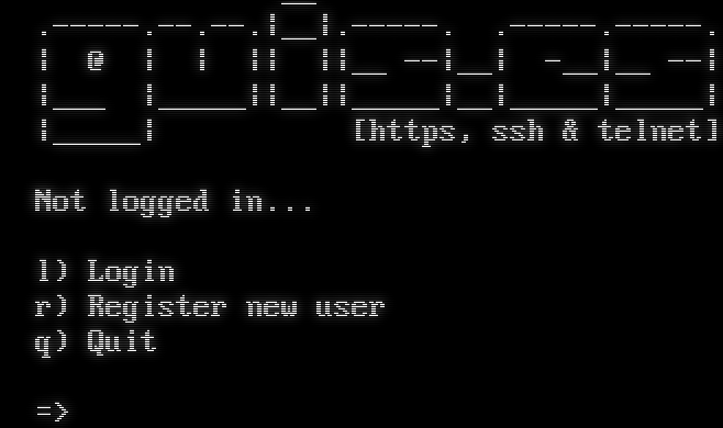 _​_.-----.--.--.\|__\|.​-----. .​-----.-----.\| @ \| \| \|\| \|\|__ --\|__\| -__\|__ --\|\|___ \|_​____\|\|__\|\|_​____\|__\|_​____\|_​____\|\|_​____\|[https, ssh & telnet]Not logged in...l) Loginr) Register new userq) Quit=>