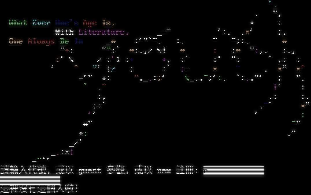 前進站畫面 (請至 pttbbs.conf 修改您的前進站畫面)'. . ", What Ever One's Age Is, + : With Literature, _-~ ':. .\*' ;, One Always Be In _\* :'"\`~. :. ~ ~;:. \* "+: ~";\` \*;.,/ \\\| \* ; :\* ";,. ;., :' \\ / :') :+ +, :\` :' ": \` ,: : ' ^ "' \|/ ; :\` ;- \* ~ . \*" \*^ -'" +: ",_.:;' \\_.,~;':. \`:.,"' ; ". \` .~ \|' : :, .: ;. ;:\` .~\` \*" '' ' : \*" ~" +: ." _/' _.:\*\| -~\`' 請輸入代號,或以 guest 參觀,或以 new 註冊: r '. . ", What Ever One's Age Is, + : With Literature, _-~ ':. .\*' ;, One Always Be In _\* :'"\`~. :. ~ ~;:. \* "+: ~";\` \*;.,/ \\\| \* ; :\* ";,. ;., :' \\ / :') :+ +, :\` :' ": \` ,: : ' ^ "' \|/ ; :\` ;- \* ~ . \*" \*^ -'" +: ",_.:;' \\_.,~;':. \`:.,"' ; ". \` .~ \|' : :, .: ;. ;:\` .~\` \*" '' ' : \*" ~" +: ." _/' _.:\*\| -~\`' 請輸入代號,或以 guest 參觀,或以 new 註冊: r  這裡沒有這個人啦!