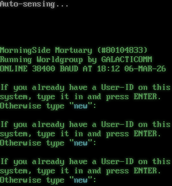 Auto-sensing...  !  WELCOME! MorningSide Mortuary (#80104833) Running Worldgroup by GALACTICOMM ONLINE 38400 BAUD AT 18:12 06-MAR-26 If you already have a User-ID on this system, type it in and press ENTER. Otherwise type "new": If you already have a User-ID on this system, type it in and press ENTER. Otherwise type "new": If you already have a User-ID on this system, type it in and press ENTER. Otherwise type "new":