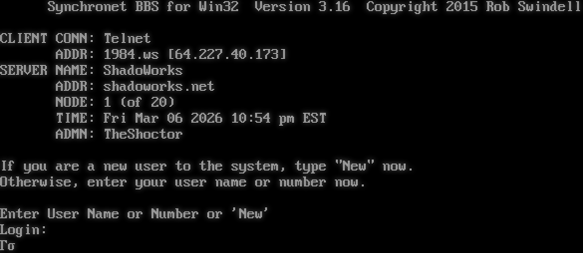Synchronet BBS for Win32 Version 3.16 Connection from: 64.227.40.173 Resolving hostname... _┬ƒZuul.connection.write('\\x1bAre you the gatekeeper?')┬£_ Synchronet BBS for Win32 Version 3.16 Copyright 2015 Rob Swindell CLIENT >>>>CONN: Telnet >>>>ADDR: 1984.ws [64.227.40.173] SERVER >>>>NAME: ShadoWorks >>>>ADDR: shadoworks.net >>>>NODE: 1 (of 20) >>>>TIME: Fri Mar 06 2026 10:54 pm EST >>>>ADMN: TheShoctor If you are a new user to the system, type "New" now. Otherwise, enter your user name or number now. Enter User Name or Number or 'New' NN:Login: Γσ