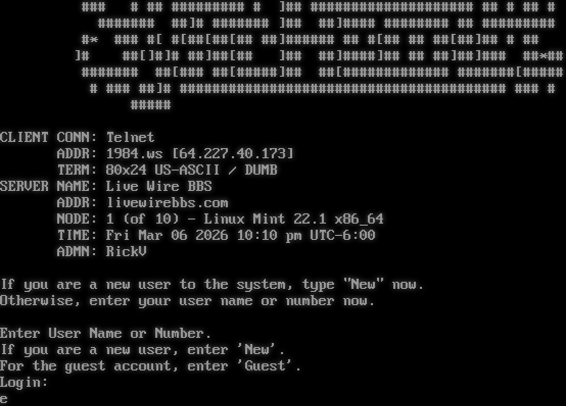 Synchronet BBS for Linux Version 3.21 Telnet connection from: 64.227.40.173 Resolving hostname... _  Synchronet BBS for Linux Version 3.21 Copyright 2026 Rob Swindell #​#### #​#### # ### # ## #​######## # ]## #​################### ## # ## # #​###### ##]# #​###### ]## ##]#​### #​####### ## #​######## #\* ### #[ #[##[##[## ##]#​##### ## #[## ## ##[##]## # ## ]# ##[]#]# ##]##[## ]## ##]#​###]## ## ##]##]### ##\*## #​###### ##[### ##[#​####]## ##[#​############ #​######[#​#### # ### ##]# #​####################################### ### # #​#### CLIENT CONN: Telnet ADDR: 1984.ws [64.227.40.173] TERM: 80x24 US-ASCII / DUMB SERVER NAME: Live Wire BBS ADDR: livewirebbs.com NODE: 1 (of 10) - Linux Mint 22.1 x86_64 TIME: Fri Mar 06 2026 10:10 pm UTC-6:00 ADMN: RickV If you are a new user to the system, type "New" now. Otherwise, enter your user name or number now. Enter User Name or Number. If you are a new user, enter 'New'. For the guest account, enter 'Guest'. Login: Bee