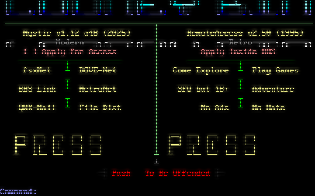 Mystic BBS Version 1.12 A48 Copyright (C) 1997-2023 By James Coyle Detecting terminal emulation: ANSI detected. ┌╔┌╦═══╦┐┌╦═══╦ ┐┌╦═══╦┐┌╔═══╦┐┌╗ ╔┐ ┌╦═ ═╦┐ ┌═╤╦╤═┐┌╦═══╦┐ │║│║ ║││║ ║│ │║ ║││╬══ └╩╤╦╤╝ ┘ │╠══╩╗┐ │║│ │║ ║│ └╩═══╩┘└╩═ ══╩┘└╩═══╩┘└╩ ╩┘└╩═ ══╩┘ └╩┘└╩═══╩┘└═╧╩ ╧═┘└╩ ╩┘ ──────────────────────────── ────┬─────────────────────────────────Mystic v1.12 a48 (2 025)│RemoteAccess v2.50 (1995)Modern │Retro[A] Apply For A ccess│Apply Inside BBS ──────────┬──── ───────│───────────┬───────────fsxNe t ┴ DOVE-Net│ Come Explore ┴ Play Games┬│┬ BBS-Link ┴ MetroNet│ SFW but 18+ ┴ Adventure┬│┬ QWK-Mail ┴ File Dist│No Ads ┴ No Hate││ ╔═╗ ┬─┐ ┌─┐ ┌─┐ ┌─┐ ┐│ ╔═╗ ┬─┐ ┌─┐ ┌─┐ ┌─┐ ┌─┐ ╠═╝ ├┬┘ ├┤ └─┐ └─┐ ││ ╠═╝ ├┬┘ ├┤ └─┐ └─┐ ┌─┘ ╩ ┴└─ └─┘ └─┘ └─┘ └┴ ╩ ┴└─ └─┘ └─┘ └─┘ └─┘ ┴─┤ Push ! To Be Offended ├─ Command: