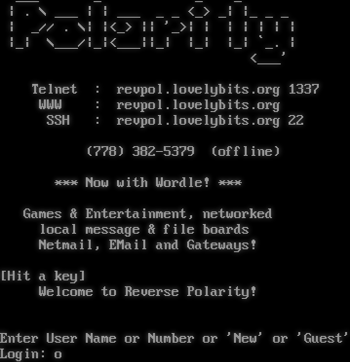 Synchronet BBS for Linux Version 3.20 Telnet connection from: 64.227.40.173 Resolving hostname... _ ∩╗┐_ Synchronet BBS for Linux Version 3.20 Copyright 2022 Rob Swindell ___ \| . \\ ___ _ _ ___ _ _ ___ ___ \| // ._>\| \| \|/ ._>\| '_><_-</ ._> \|_\\_\\\\_​__.\|__/ \\_​__.\|_\| /__/\\_​__. ___ _ _ _ \| . \\ ___ \| \| ___ _ _ <_> _\| \|_ _ _ \| _// . \\\| \|<_> \|\| '_>\| \| \| \| \| \| \| \|_\| \\___/\|_\|<___\|\|_\| \|_\| \|_\| \`_. \| <___' Telnet : revpol.lovelybits.org 1337 WWW : revpol.lovelybits.org SSH : revpol.lovelybits.org 22 (778) 382-5379 (offline) \*\*\* Now with Wordle! \*\*\* Games & Entertainment, networked local message & file boards Netmail, EMail and Gateways! [Hit a key]              Welcome to Reverse Polarity! NN: Enter User Name or Number or 'New' or 'Guest' Login: o