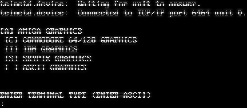 telnetd.device: Waiting for unit to answer. telnetd.device: Connected to TCP/IP port 6464 unit 0.  [A] AMIGA GRAPHICS [C] COMMODORE 64/128 GRAPHICS [I] IBM GRAPHICS [S] SKYPIX GRAPHICS [ ] ASCII GRAPHICS ENTER TERMINAL TYPE (ENTER=ASCII) :
