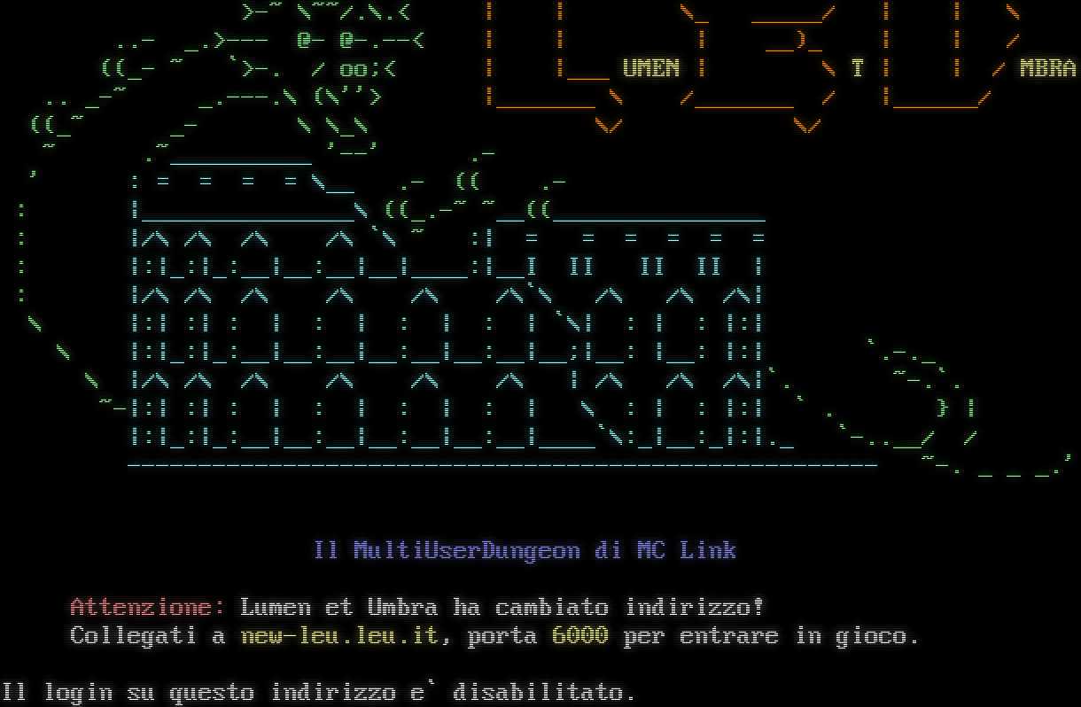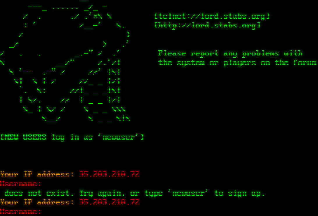 Debian GNU/Linux 9 __ -​--_ .​..... _/_ - / . ./ .'\*\\ \\ [telnet://lord.stabs.org] : ' /__-' \\. [http://lord.stabs.org] / ) _/ > .' / . . _​.-" / .' Please report any problems with \\ __/" /.'/\| the system or players on the forum \\ '-- .-" / //' \|\\\| \\\| \\ \| / //_ _ \|/\| \`. \\: //\|_ _ _\|\\\| \| \\/. // \| _ _ \|/\| \\_ \| \\/ / \\ _ _ \\\\\\ \\__/ \\ _ _ \\\|\\ [NEW USERS log in as 'newuser'] Your IP address: 35.203.210.72 Username: does not exist. Try again, or type 'newuser' to sign up. Your IP address: 35.203.210.72 Username: