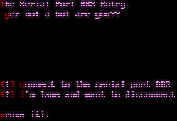 Mystic BBS Version 1.12 A48 Copyright (C) 1997-2023 By James Coyle Detecting terminal emulation: ANSI detected. The Serial Port BBS Entry. yer not a bot are you?? (1) connect to the serial port BBS (!) i'm lame and want to disconnect prove it!: