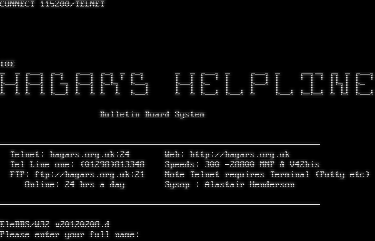 CONNECT 115200/TELNET [0E ╦ ╦ ╔──╗ ╔─╗ ╔──╗ ╔─╗ ╦ ╔─╗ ╦ ╦ ╔──╗ ╦ ╔──╗ ╦ ╔═╗═╗ ╔╗ ╦ ╔──╗ ╠──╣ ╠──╣ ║ ═╗ ╠──╣ ╠─╚╗ ╚──╗ ╠──╣ ╠─ ║ ╠──╝ ║ ║ ║╚╗║ ╠─ ╩ ╩ ╩ ╩ ╚──╝ ╩ ╩ ╩ ╩ ╚──╝ ╩ ╩ ╚──╝ ╚──╝ ╩ ╚──╝ ╚═╚═╝ ╩ ╚╝ ╚──╝ Bulletin Board System ──────────────────────────────────────────────────────────────── Telnet: hagars.org.uk:24 Web: http://hagars.org.uk Tel Line one: (01298)813348 Speeds: 300 -28800 MNP & V42bis FTP: ftp://hagars.org.uk:21 Note Telnet requires Terminal (Putty etc) Online: 24 hrs a day Sysop : Alastair Henderson ──────────────────────────────────────────────────────────────── \*\*EMSI_IRQ8E08 EleBBS/W32 v20120208.d Please enter your full name: