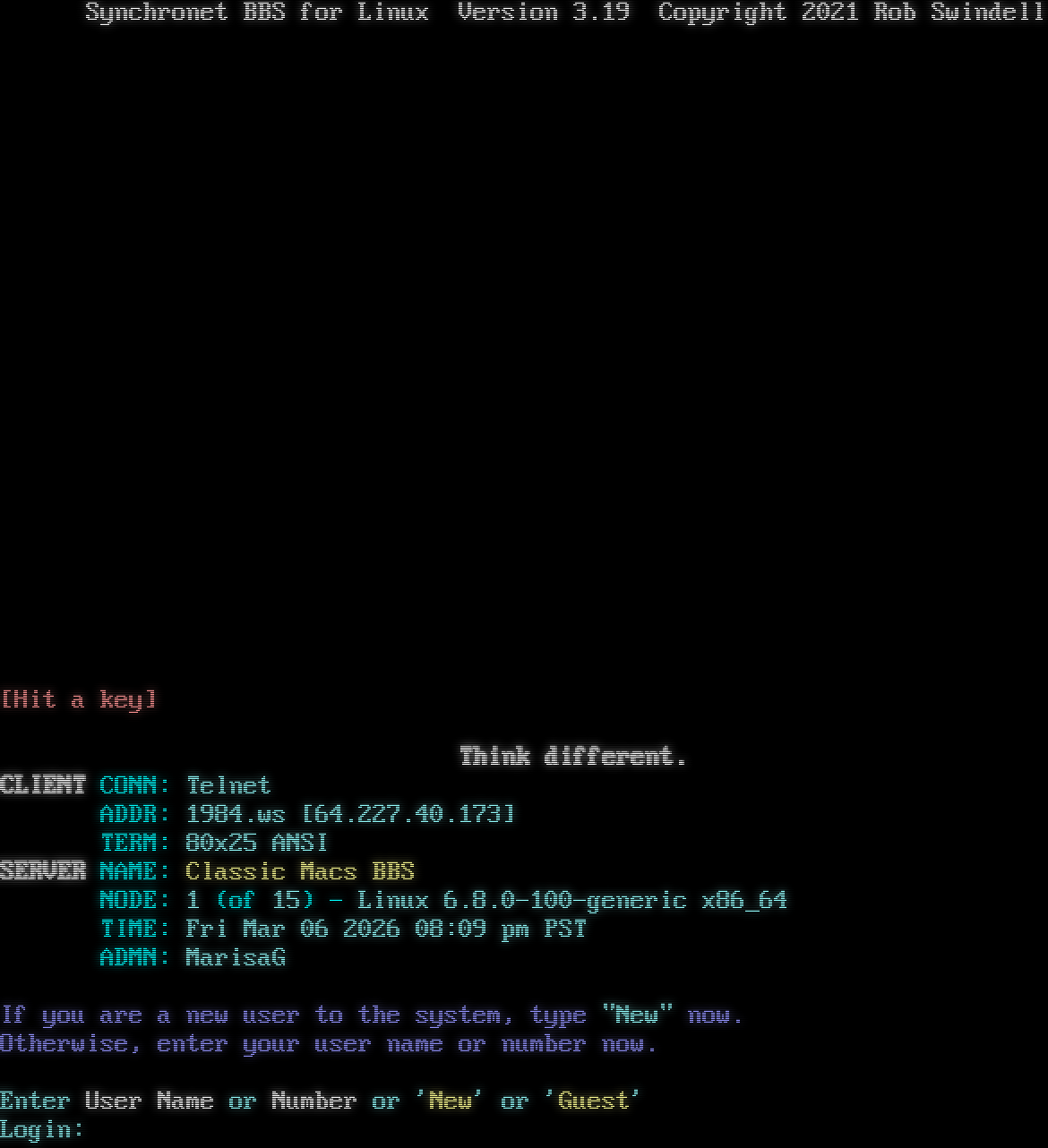 Synchronet BBS for Linux Version 3.19 Telnet connection from: 64.227.40.173 Resolving hostname... _ _ Synchronet BBS for Linux Version 3.19 Copyright 2021 Rob Swindell [Hit a key]              Think different. CLIENT CONN: Telnet ADDR: 1984.ws [64.227.40.173] TERM: 80x25 ANSI SERVER NAME: Classic Macs BBS NODE: 1 (of 15) - Linux 6.8.0-100-generic x86_64 TIME: Fri Mar 06 2026 08:09 pm PST ADMN: MarisaG If you are a new user to the system, type "New" now. Otherwise, enter your user name or number now. Enter User Name or Number or 'New' or 'Guest' Login: