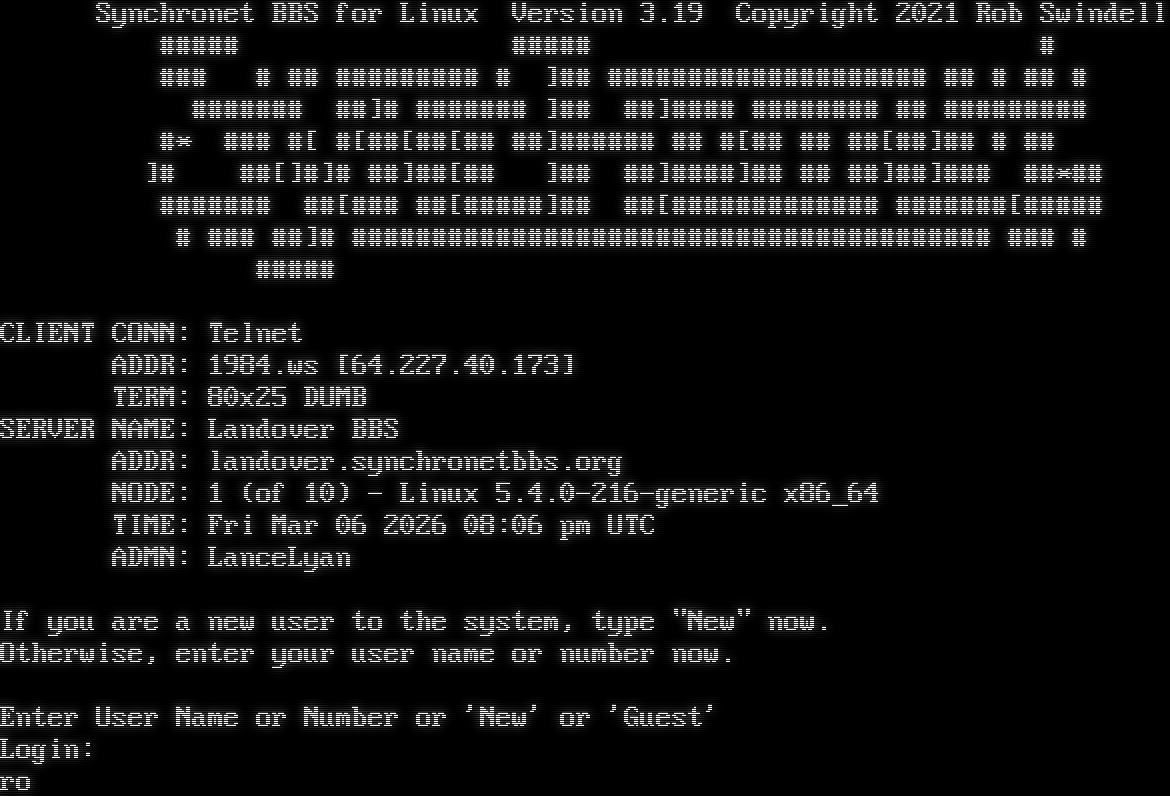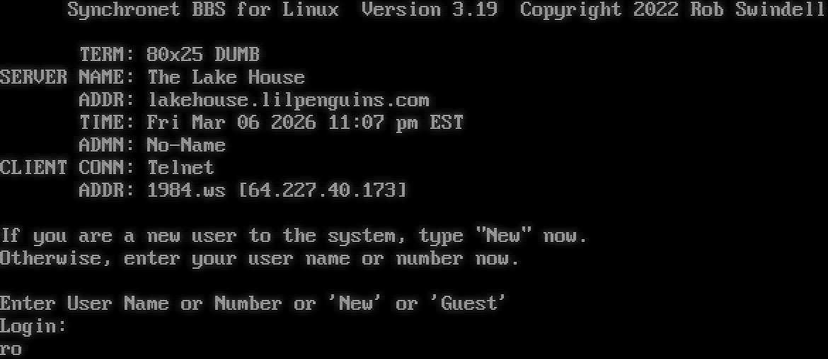 Synchronet BBS for Linux Version 3.19 Telnet connection from: 64.227.40.173 Resolving hostname...  _ _ Synchronet BBS for Linux Version 3.19 Copyright 2022 Rob Swindell TERM: 80x25 DUMB SERVER NAME: The Lake House ADDR: lakehouse.lilpenguins.com TIME: Fri Mar 06 2026 11:07 pm EST ADMN: No-Name CLIENT CONN: Telnet ADDR: 1984.ws [64.227.40.173] If you are a new user to the system, type "New" now. Otherwise, enter your user name or number now. Enter User Name or Number or 'New' or 'Guest' Login: ro
