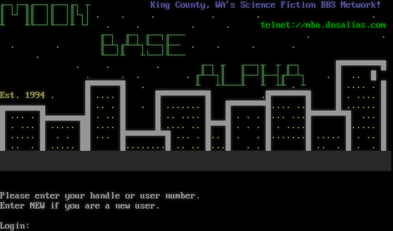─────VADV32 v6.1.230119 - (c) 2004-2023 Aspect Technologies - www.vadvbbs.com o NetFoss - Revision 5 FOSSIL - Com Eng v1.25 - (c) 2001-2021 pcmicro.com Connected @ 11520 to Moon Base Alpha on line 1 Virtual Advanced 2.10 for DOS Multi-User Multi-Network Graphical Bulletin Board System Serial #09719802 Network Detection Phase Press [Esc] Twice or wait for BBS. °° \*\*EMSI_REQA77E Checking for ANSI/RIP !╓─┐┌─╖╓──┐╓──┐╓┐ ┬ King County, WA's Science Fiction BBS Network! ║ └┘ ║║ │║ │║└┐│ . . . . . . ╨ ╨╙──┘╙──┘╨ └┘ . . . . telnet://mba.dnsalias.com ╓─┐ ╓─┐ ╓──┐╓─── . . . . ╟─┴┐╓╨─┴┐╙──┐╟── . . . . . ╙──┘╨ ┴└──┘╙─── . . . ╓─┐ ╥ ╓──┐╥ ┬ ╓─┐ █▀▀▀▀▀▀▀▀█ . . . . ╓╨─┴┐║ ╟──┘╟──┤╓╨─┴┐ . █  ..  █ █▀▀▀▀▀▀█ . ╨ ┴╙───╨ ╨ ┴╨ . ┴ █ .​... . █ Est. 1994 . █ .​... █ █▀▀▀▀▀▀▀▀▀█ .█▀▀▀▀▀▀▀█ █ . .​... █ ▄▄▄▄▄▄▄▄▄ █ .. . █ . █ .​...... █ █▀▀▀▀▀▀▀█.​... ..█ █ .​..... █ █ ... . █▄▄▄▄▄▄▄▄█ . .. █ █ .. .​... █ █ . . . █... ...█▀▀▀▀▀▀▀█ ... █ █ . ... █ .​.... ██ .​... █ █ .​... .. █▀▀▀█ . . . █ . .​...█ █.​.... █ █ .​.... █ . . ██ ... █▀▀▀▀▀▀▀▀█ ... . █.. █ . . █.​......█ .​.... █ . .. █ █ .. . █ .​.... ██ █.​.......█ .. .. █...█ . . █ █ .. . █ . . █ ░░░░░░░░░░░░░░░░░░░░░░░░░░░░░░░░░░░░░░░░░░░░░░░░░░░░░░░░░░░░░░░░░░░░░░░░░░░░░░ ░░░░░░░░░░░░░░░░░░░░░░░░░░░░░░░░░░░░░░░░░░░░░░░░░░░░░░░░░░░░░░░░░░░░░░░░░░░░░░ Please enter your handle or user number. Enter NEW if you are a new user. Login: