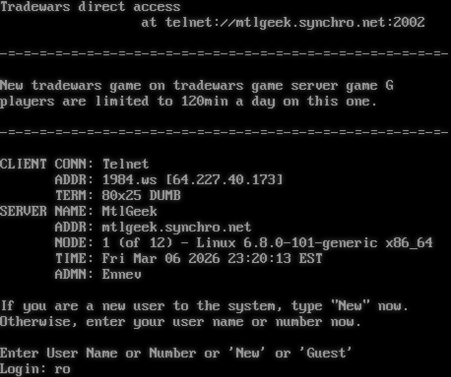 Synchronet BBS for Linux Version 3.18 Telnet connection from: 64.227.40.173 Resolving hostname... _ ∩╗┐_ Synchronet BBS for Linux Version 3.18 Copyright 2020 Rob Swindell  terminal client must support ansi-pc for better display =​======================================================== WELCOME TO : _​____ __ .__ _​_______ __ /\\_/ \|_\| \| / _​____/ _​___ _​___ \| \| __ / \\ / \\ __\\ \| / \\ _​___/ __ \\/ __ \\\| \|/ / / Y \\ \| \| \|_\\ \\_\\ \\ ___\| ___/\| < \\_​___\|__ /__\| \|_​___/\\_​_____ /\\___ >___ >__\|_ \\ \\/ \\/\\/ \\/\\/ (MTLGEEK) Montreal, Quebec, Canada recommended terminal : https://sourceforge.net/projects/syncterm/ Tradewars direct access at telnet://mtlgeek.synchro.net:2002 recommended terminal : https://sourceforge.net/projects/syncterm/ Tradewars direct access at telnet://mtlgeek.synchro.net:2002 -​=-=-=-=-=-=-=-=-=-=-=-=-=-=-=-=-=-=-=-=-=-=-=-=-=-=-=-=- New tradewars game on tradewars game server game G players are limited to 120min a day on this one. -​=-=-=-=-=-=-=-=-=-=-=-=-=-=-=-=-=-=-=-=-=-=-=-=-=-=-=-=- CLIENT CONN: Telnet ADDR: 1984.ws [64.227.40.173] TERM: 80x25 DUMB SERVER NAME: MtlGeek ADDR: mtlgeek.synchro.net NODE: 1 (of 12) - Linux 6.8.0-101-generic x86_64 TIME: Fri Mar 06 2026 23:20:13 EST ADMN: Ennev If you are a new user to the system, type "New" now. Otherwise, enter your user name or number now. Enter User Name or Number or 'New' or 'Guest' Login: ro