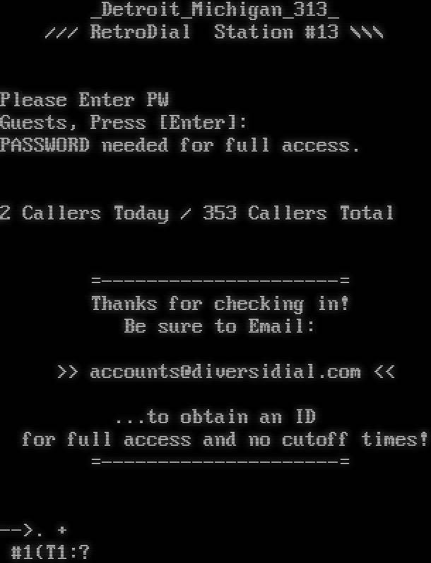 CONNECT Back from the ashes...You've reached: -​----------------------- << L a t e N i g h t >> -​----------------------- _Detroit_Michigan_313_ /// RetroDial Station #13 \\\\\\ Please Enter PW Guests, Press [Enter]: PASSWORD needed for full access. 2 Callers Today / 353 Callers Total =​---------------------= Thanks for checking in! Be sure to Email: >> accounts@diversidial.com << ...to obtain an ID for full access and no cutoff times! =​---------------------= -->. + #1(T1:?