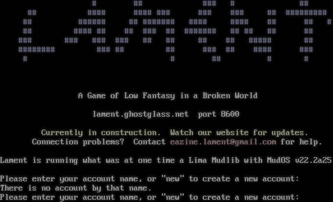 Lament. Detecting terminal type... Remote system reports xterm-256color. # ## ### # ## ## #​### #​### ### ### ### ## #​######## ## #​##### ## #​###### #​### #​### ## ## # ## #​### ## ## ### ## #​###### ## ## ## ## ### ### ### ### ## ## ## ## #​#### ## #​####### ### ## ## ### ## #​### ### # # ## # # A Game of Low Fantasy in a Broken World lament.ghostglass.net port 8600 Currently in construction. Watch our website for updates. Connection problems? Contact eazine.lament@gmail.com for help. Lament is running what was at one time a Lima Mudlib with MudOS v22.2a25 Please enter your account name, or "new" to create a new account: There is no account by that name. Please enter your account name, or "new" to create a new account:
