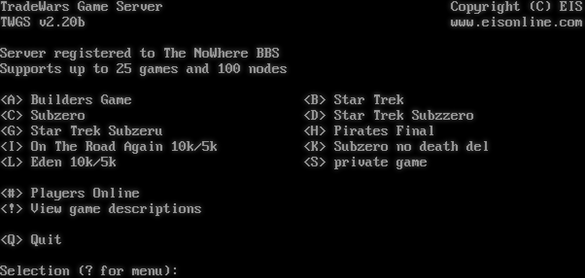 Telnet connection detected. Please enter your name (ENTER for none): TradeWars Game Server Copyright (C) EIS TWGS v2.20b www.eisonline.com Server registered to The NoWhere BBS Supports up to 25 games and 100 nodes <A> Builders Game <B> Star Trek <C> Subzero <D> Star Trek Subzzero <G> Star Trek Subzeru <H> Pirates Final <I> On The Road Again 10k/5k <K> Subzero no death del <L> Eden 10k/5k <S> private game <#> Players Online <!> View game descriptions <Q> Quit Selection (? for menu):