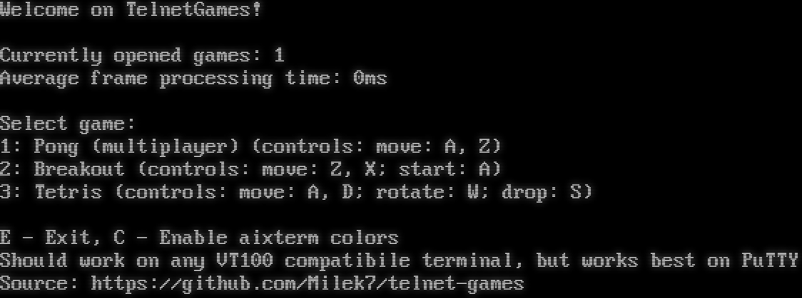 Welcome on TelnetGames!Currently opened games: 1Average frame processing time: 0msSelect game:1: Pong (multiplayer) (controls: move: A, Z) 2: Breakout (controls: move: Z, X; start: A) 3: Tetris (controls: move: A, D; rotate: W; drop: S) E - Exit, C - Enable aixterm colors Should work on any VT100 compatibile terminal, but works best on PuTTY Source: https://github.com/Milek7/telnet-games 10ms