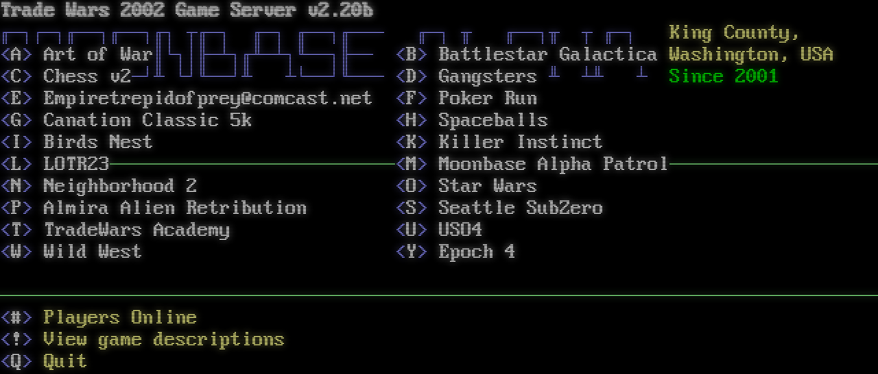 Telnet connection detected. Please enter your name (ENTER for none): TradeWars Game Server Copyright (C) EIS TWGS v2.20b www.eisonline.com Server registered to Lee F. Wilson Supports up to 25 games and 100 nodes Trade Wars 2002 Game Server v2.20b ╓─┐┌─┐╓──┐╓──┐╓┐ ┬╓─┐ ╓─┐ ╓──┐╓─── ╓─┐ ╥ ╓──┐╥ ┬ ╓─┐ King County, ║ └┘ │║ │║ │║└┐│╟─┴┐╓╨─┴┐╙──┐╟── ╓╨─┴┐║ ╟──┘╟──┤╓╨─┴┐ Washington, USA ╨ ┴╙──┘╙──┘╨ └┘╙──┘╨ ┴└──┘╙─── ╨ ┴╙───╨ ╨ ┴╨ ┴ Since 2001 E-Mail: intrepidofprey@comcast.net ────────────────────────────────────────────────────────────────────────────────<A> Art of War<B> Battlestar Galactica <C> Chess v2<D> Gangsters <E> Empire<F> Poker Run <G> Canation Classic 5k<H> Spaceballs <I> Birds Nest<K> Killer Instinct <L> LOTR23<M> Moonbase Alpha Patrol <N> Neighborhood 2<O> Star Wars <P> Almira Alien Retribution<S> Seattle SubZero <T> TradeWars Academy<U> USO4 <W> Wild West<Y> Epoch 4 ────────────────────────────────────────────────────────────────────────────────<#> Players Online <!> View game descriptions <Q> Quit