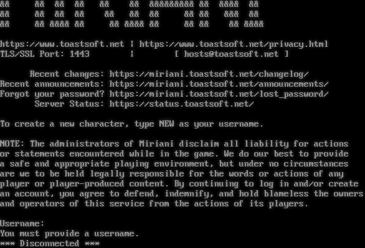 WARNING: This is the Miriani test server. Nothing you do here will be saved in the game proper. This server will be shut down. The real Miriani can be accessed on port 1443 (TLS) or 1234 (standard). Welcome to... && && &&&& &&&&&&&& &&&& &&& && && &&&& &&& &&& && && && && && && &&& && && &&&& &&&& && && && && && && &&&& && && && &&& && && &&&&&&&& && && && && && && && && && && && && && &&&&&&&&& && &&&& && && && && && && && && && && &&& && && && &&&& && && &&&& && && && && &&&& https://www.toastsoft.net \| https://www.toastsoft.net/privacy.html TLS/SSL Port: 1443 \| [ hosts@toastsoft.net ] Recent changes: https://miriani.toastsoft.net/changelog/ Recent announcements: https://miriani.toastsoft.net/announcements/ Forgot your password? https://miriani.toastsoft.net/lost_password/ Server Status: https://status.toastsoft.net/ To create a new character, type NEW as your username. NOTE: The administrators of Miriani disclaim all liability for actions or statements encountered while in the game. We do our best to provide a safe and appropriate playing environment, but under no circumstances are we to be held legally responsible for the words or actions of any player or player-produced content. By continuing to log in and/or create an account, you agree to defend, indemnify, and hold blameless the owners and operators of this service from the actions of its players. Username: You must provide a username. \*\*\* Disconnected \*\*\*