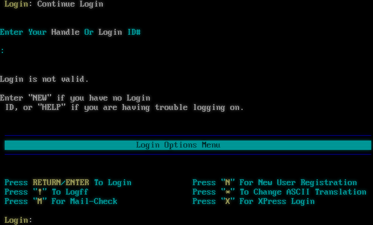 waiting for connection... ...connected to port 6400 welcome to the lexicon please hang on as old software can be slow! ATA IMAGE BBS 64 V3.0 (C) 2025  CONNECTION CONFIRMED: 38400 ANSI/Graphics Detected Are You in 80 Columns?: [Yes]      Yes ────────────────────────────────────────────────────────────────────────────── Image BBS v3.0 (c) 2020 NISSA ────────────────────────────────────────────────────────────────────────────── Welcome to LEXICON. It is now Fri Mar 6, 2026 11:05 PM. The last caller was NetMail From WNH. ────────────────────────────────────────────────────────────────────────────── Login Options Menu ────────────────────────────────────────────────────────────────────────────── Press RETURN/ENTER To Login Press "N" For New User Registration Press "!" To Logff Press "\*" To Change ASCII Translation Press "M" For Mail-Check Press "X" For XPress Login Login: Continue Login Enter Your Handle Or Login ID# : Login is not valid. Enter "NEW" if you have no Login ID, or "HELP" if you are having trouble logging on. ────────────────────────────────────────────────────────────────────────────── Login Options Menu ────────────────────────────────────────────────────────────────────────────── Press RETURN/ENTER To Login Press "N" For New User Registration Press "!" To Logff Press "\*" To Change ASCII Translation Press "M" For Mail-Check Press "X" For XPress Login Login: Continue Login Enter Your Handle Or Login ID# : Login is not valid. Enter "NEW" if you have no Login ID, or "HELP" if you are having trouble logging on. ────────────────────────────────────────────────────────────────────────────── Login Options Menu ────────────────────────────────────────────────────────────────────────────── Press RETURN/ENTER To Login Press "N" For New User Registration Press "!" To Logff Press "\*" To Change ASCII Translation Press "M" For Mail-Check Press "X" For XPress Login Login: