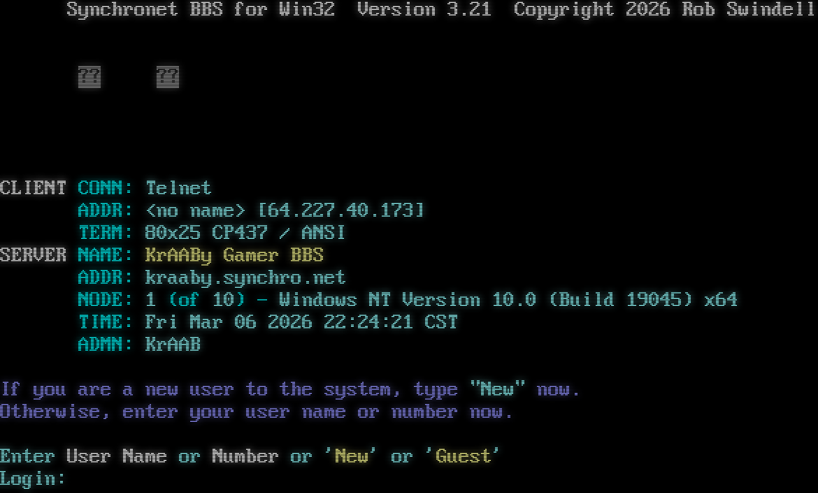Synchronet BBS for Win32 Version 3.21 Telnet connection from: 64.227.40.173 _  Synchronet BBS for Win32 Version 3.21 Copyright 2026 Rob Swindell ۰۰ ܰ ۰۰ ߰ ܰ CLIENT CONN: Telnet ADDR: <no name> [64.227.40.173] TERM: 80x25 CP437 / ANSI SERVER NAME: KrAABy Gamer BBS ADDR: kraaby.synchro.net NODE: 1 (of 10) - Windows NT Version 10.0 (Build 19045) x64 TIME: Fri Mar 06 2026 22:24:21 CST ADMN: KrAAB If you are a new user to the system, type "New" now. Otherwise, enter your user name or number now. Enter User Name or Number or 'New' or 'Guest' Login: