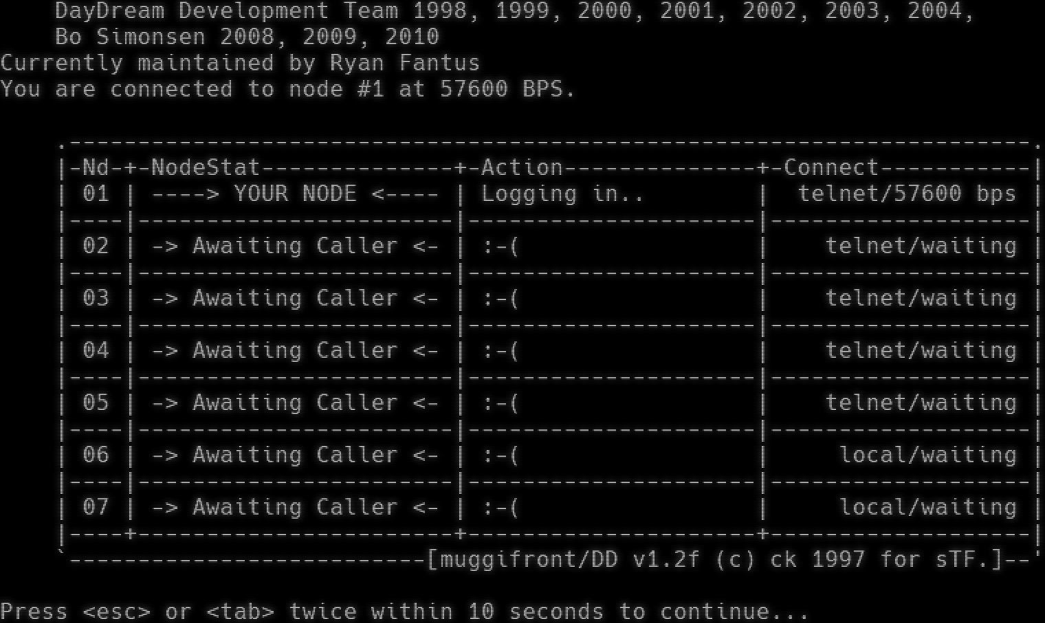 DayDream BBS/UNiX 2.15a Programming by Antti Hyrynen 1996, 1997, DayDream Development Team 1998, 1999, 2000, 2001, 2002, 2003, 2004, Bo Simonsen 2008, 2009, 2010 Currently maintained by Ryan Fantus You are connected to node #1 at 57600 BPS. .​----------------------------------------------------------------------. \|-Nd-+-NodeStat-​-------------+-Action-​-------------+-Connect-​----------\| \| 01 \| -​---> YOUR NODE <-​--- \| Logging in.. \| telnet/57600 bps \| \|-​---\|-​----------------------\|-​--------------------\|-​------------------\| \| 02 \| -> Awaiting Caller <- \| :-( \| telnet/waiting \| \|-​---\|-​----------------------\|-​--------------------\|-​------------------\| \| 03 \| -> Awaiting Caller <- \| :-( \| telnet/waiting \| \|-​---\|-​----------------------\|-​--------------------\|-​------------------\| \| 04 \| -> Awaiting Caller <- \| :-( \| telnet/waiting \| \|-​---\|-​----------------------\|-​--------------------\|-​------------------\| \| 05 \| -> Awaiting Caller <- \| :-( \| telnet/waiting \| \|-​---\|-​----------------------\|-​--------------------\|-​------------------\| \| 06 \| -> Awaiting Caller <- \| :-( \| local/waiting \| \|-​---\|-​----------------------\|-​--------------------\|-​------------------\| \| 07 \| -> Awaiting Caller <- \| :-( \| local/waiting \| \|-​---+-----------------------+---------------------+-------------------\| \`-​-------------------------[muggifront/DD v1.2f (c) ck 1997 for sTF.]--' Press <esc> or <tab> twice within 10 seconds to continue...