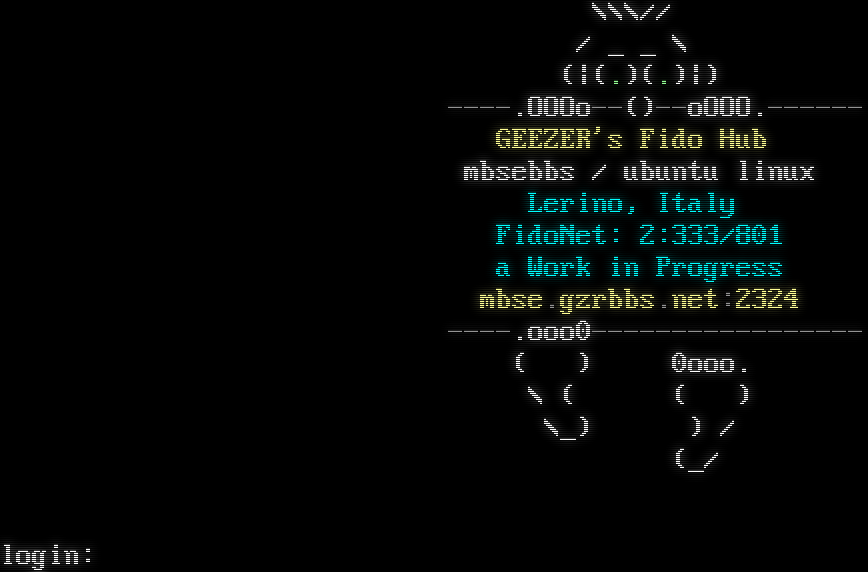 Ubuntu 22.04.5 LTS MBSE BBS v1.1.5 (Release: Dec 24 2025) Copyright (C) 1997-2025 MBSE Development Team, All Rights Reserved \\\\\\// / _ _ \\ (\|(.)(.)\|) -​---.OOOo--()--oOOO.​------ GEEZER's Fido Hub mbsebbs / ubuntu linux Lerino, Italy FidoNet: 2:333/801 a Work in Progress mbse.gzrbbs.net:2324 -​---.ooo0-​---------------- ( )0ooo. \\ (( ) \\_)) / (_/ login: