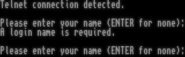 Telnet connection detected. Please enter your name (ENTER for none): A login name is required. Please enter your name (ENTER for none):